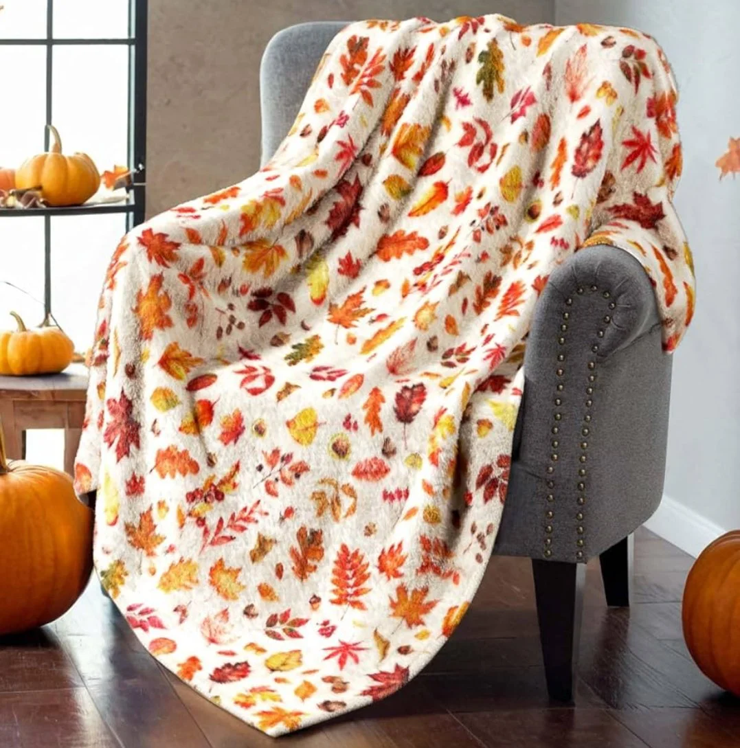 Sometimes fall decorating calls for a touch of fun, and this leaf-print throw brings just that. Bright, cheerful, and kid-friendly, while also being warm and cozy. Perfect for family movie nights, afternoon reading, or draping over a childβs bed, it lets everyone share in the cuddly warmth and festive autumn colors.