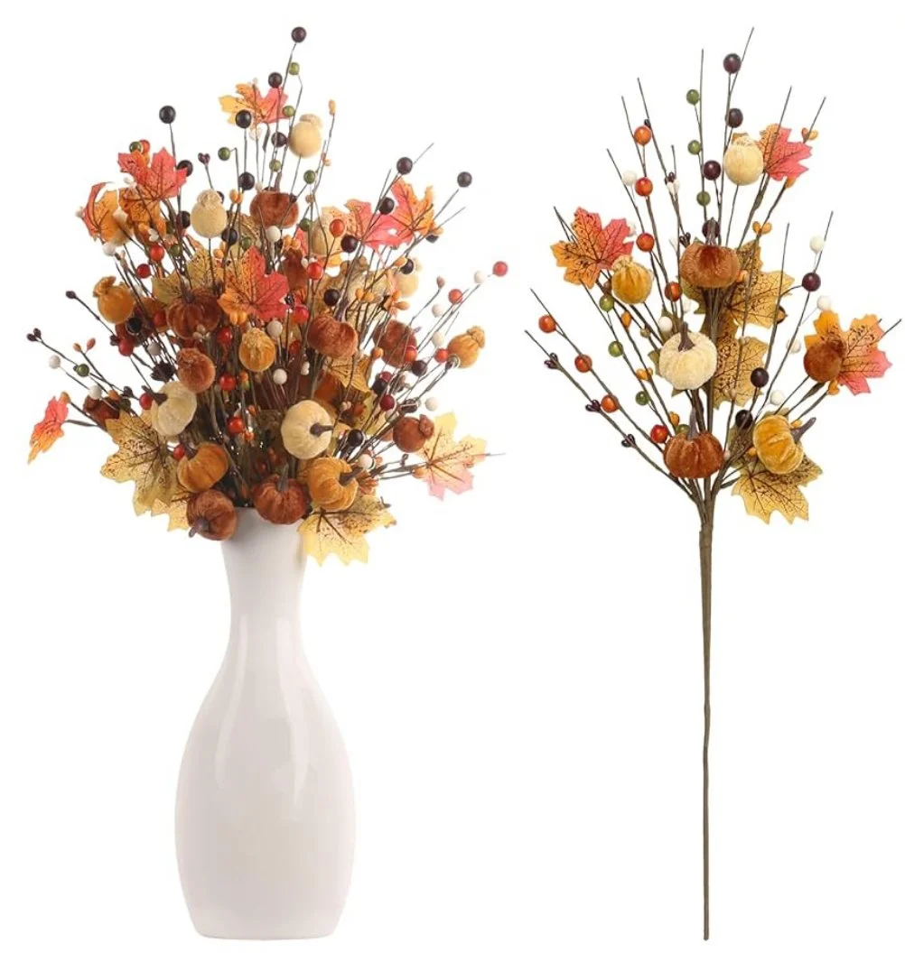 These playful stems bring the pumpkin season right into your home - with tiny faux pumpkins, clusters of berries, and bright fall leaves all in one. They add depth and texture to arrangements, making them the perfect compliment to the softer eucalyptus stems listed above. Tuck them into a vase on their own for a cheerful pop of color, or layer them together for a full, abundant fall bouquet.