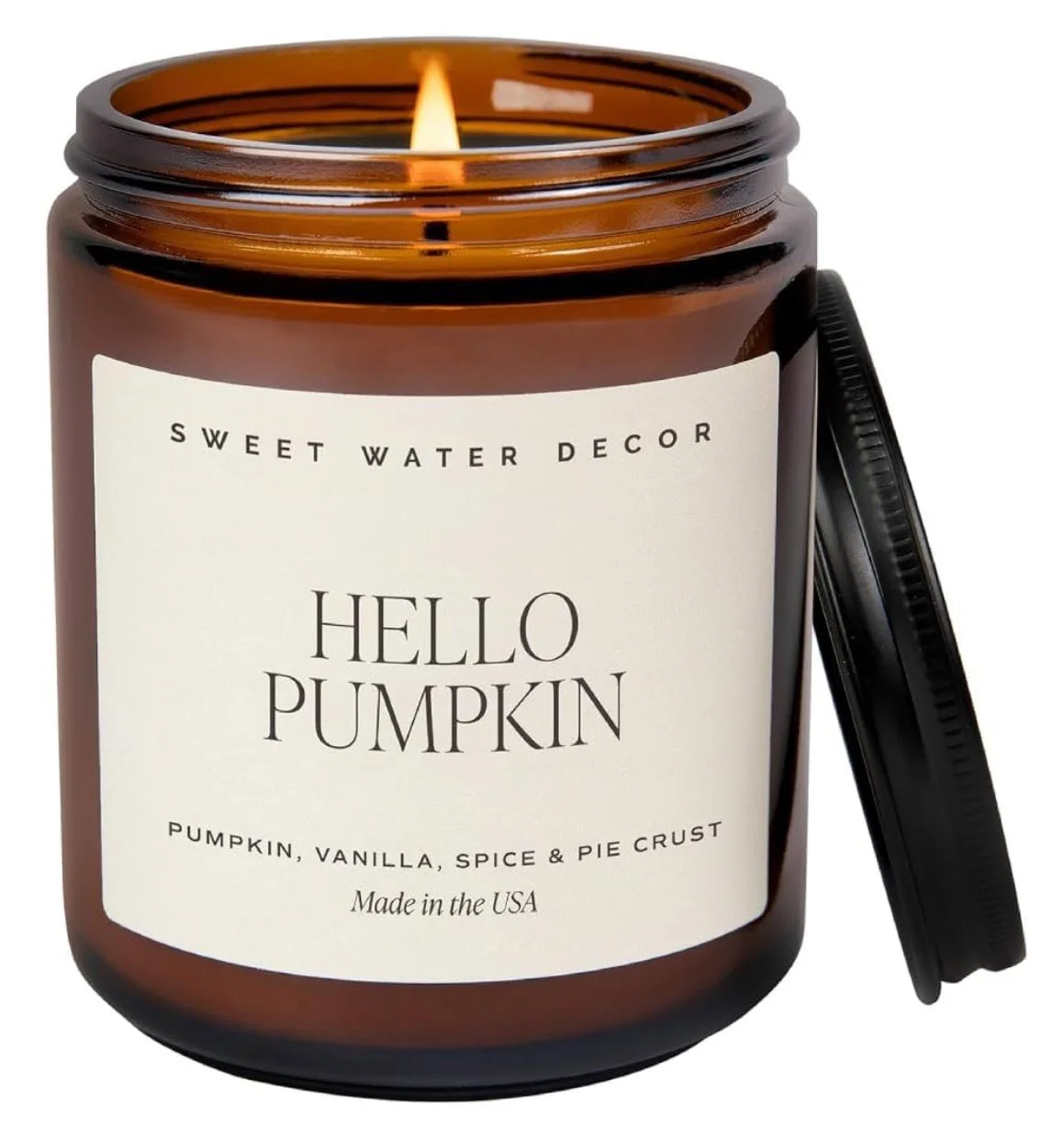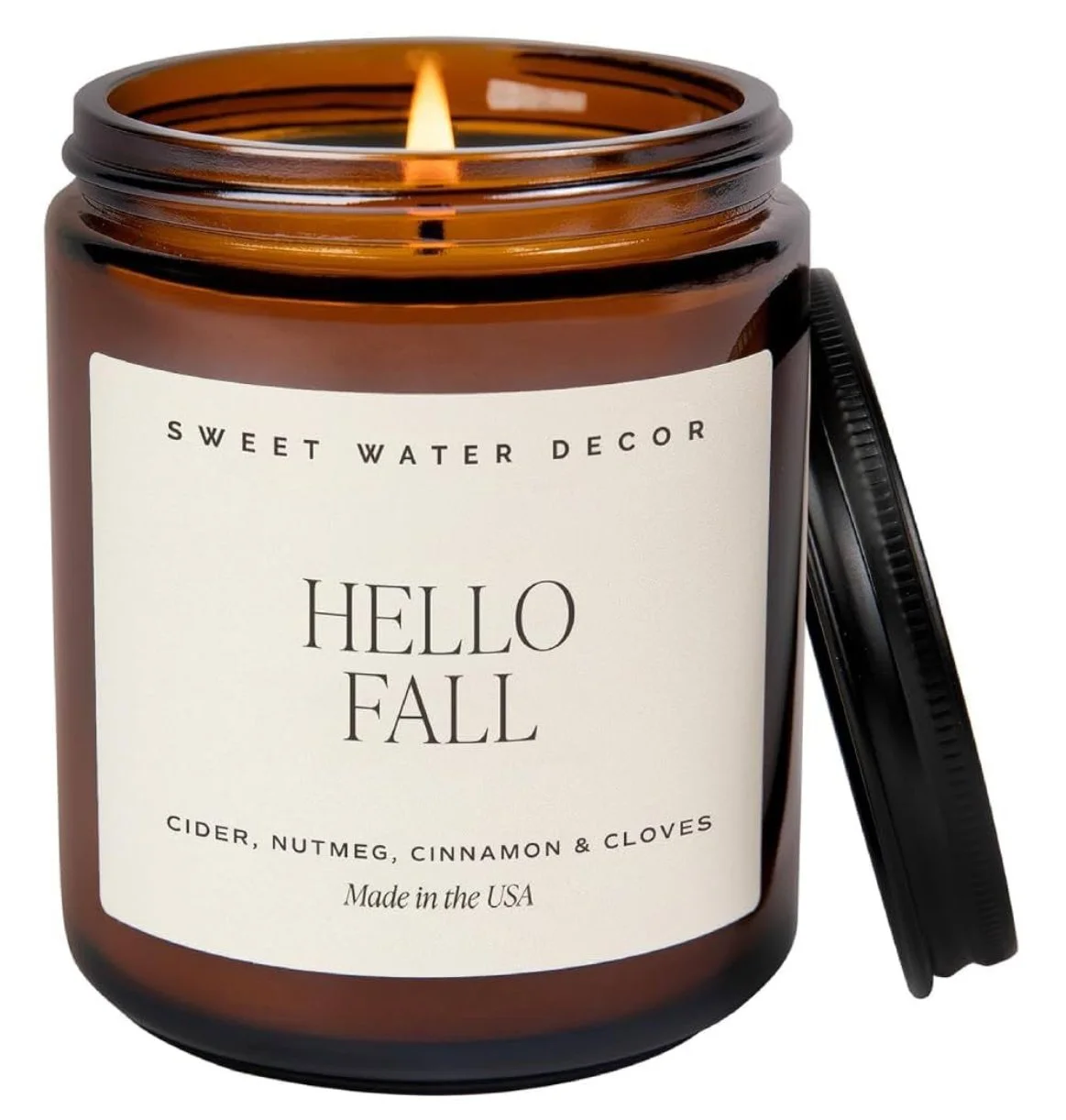 Nothing sets the fall mood better than a comforting scent lingering in the air. This βHello Fallβ candle offers 40 hours of burn time that fills your space with notes of hot apple cider, nutmeg, cinnamon, and cloves. The amber colored glass, simplicity of the label, and screw-top lid make this a simple fall must-have.