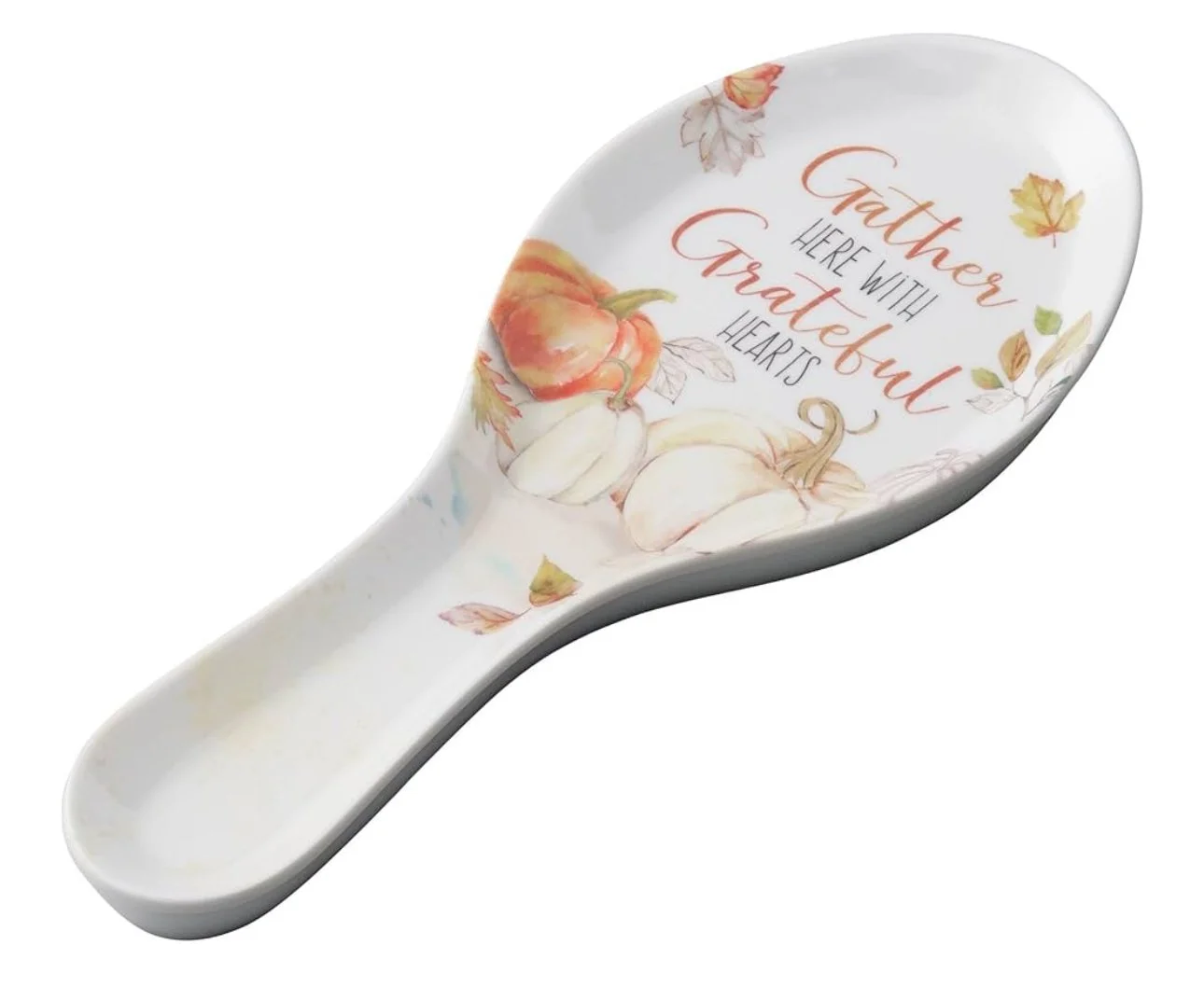 This melamine stove top spoon rest was a unique and unexpected find. Easy to clean, kid-friendly, and heartwarming this little kitchen addition is a gentle and practical way to add a subtle touch of fall to your stove top. It matches the dinner plates in the way it looks like a watercolor painting, the pumpkins with their soft, muted colors, and the quote is a reminder of what Thanksgiving is all about. Gathering with loved ones and being grateful for all we have.