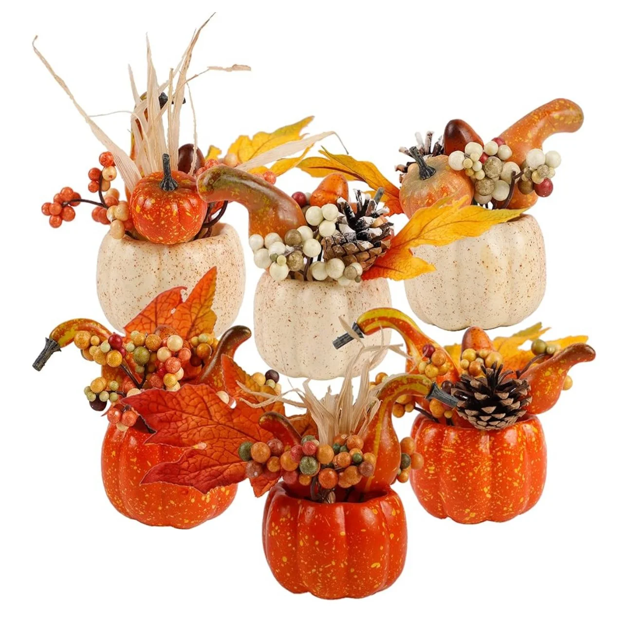 This set of six little fall arrangements are perfect to dress up your table for your Thanksgiving Day feast or to simply place them around in the nooks and empty spaces around your home to add a splash of fall color. The each have clusters of multicolored berries, gourds, pumpkins, and pinecones. So much packed into each little pumpkin base. Theyβre offer two different color themes which make them a versatile fall decoration as well.