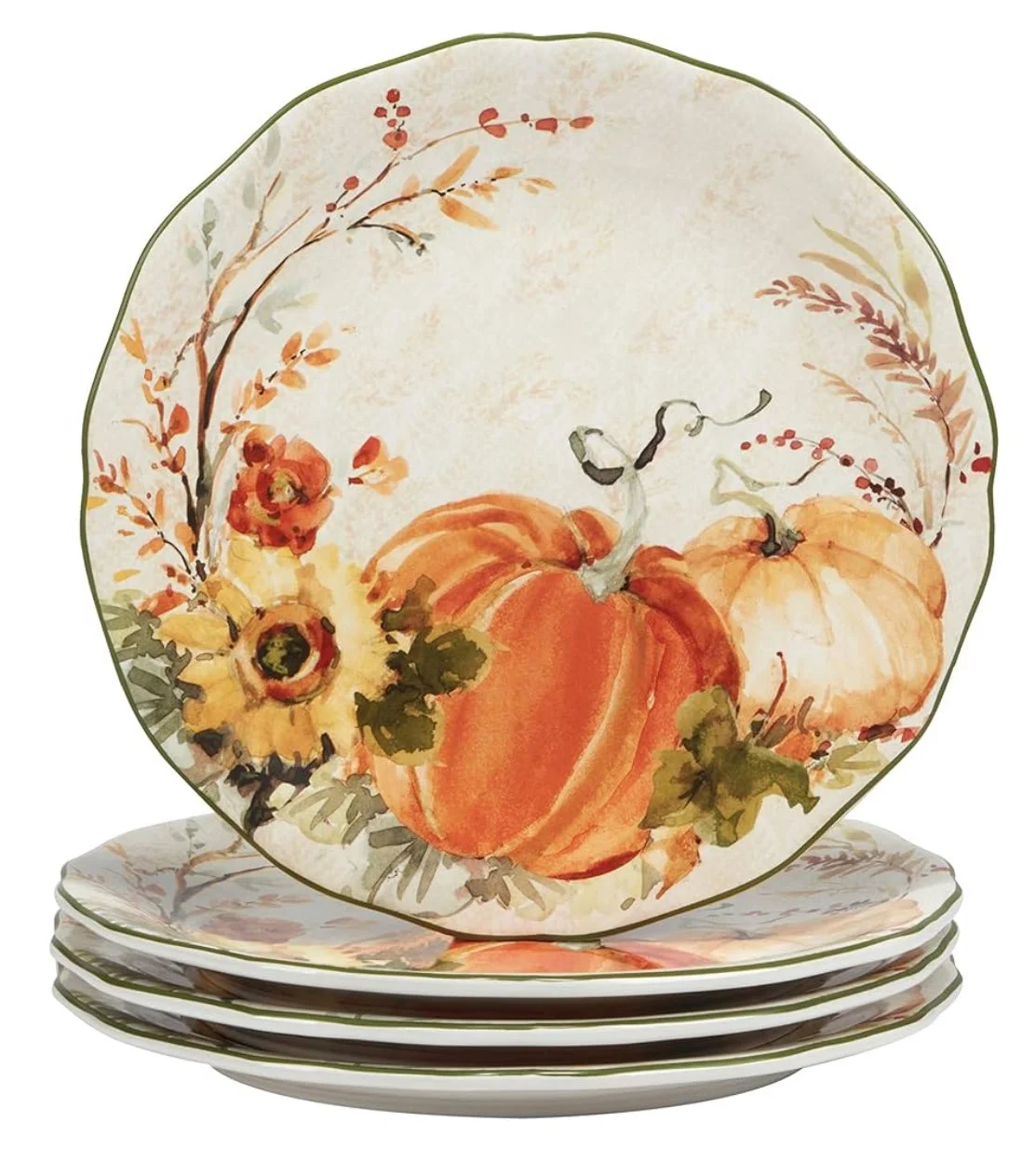 These dinner plates carry the pumpkin perfection theme beautifully with the look of a watercolor painting they offer soft, muted colors that go well with everything else in this list. These would look great on the round camel colored placemats listed above. These are 11β in diameter and come in a set of four.