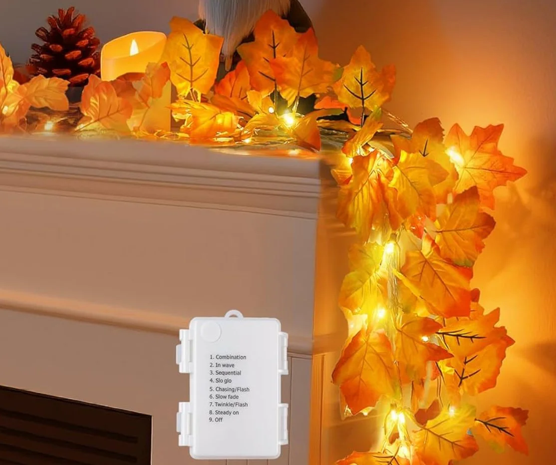 Garland is lovely on its own, but add a little glow and it becomes pure magic. This battery-powered maple leaf garland has eight different light settings - from twinkle to soft fade - so you can set just the right mood. Draped across a mantel, on top of cabinets, or on a bookshelf, it brings golden, warm sparkle and autumn vibes into any space.